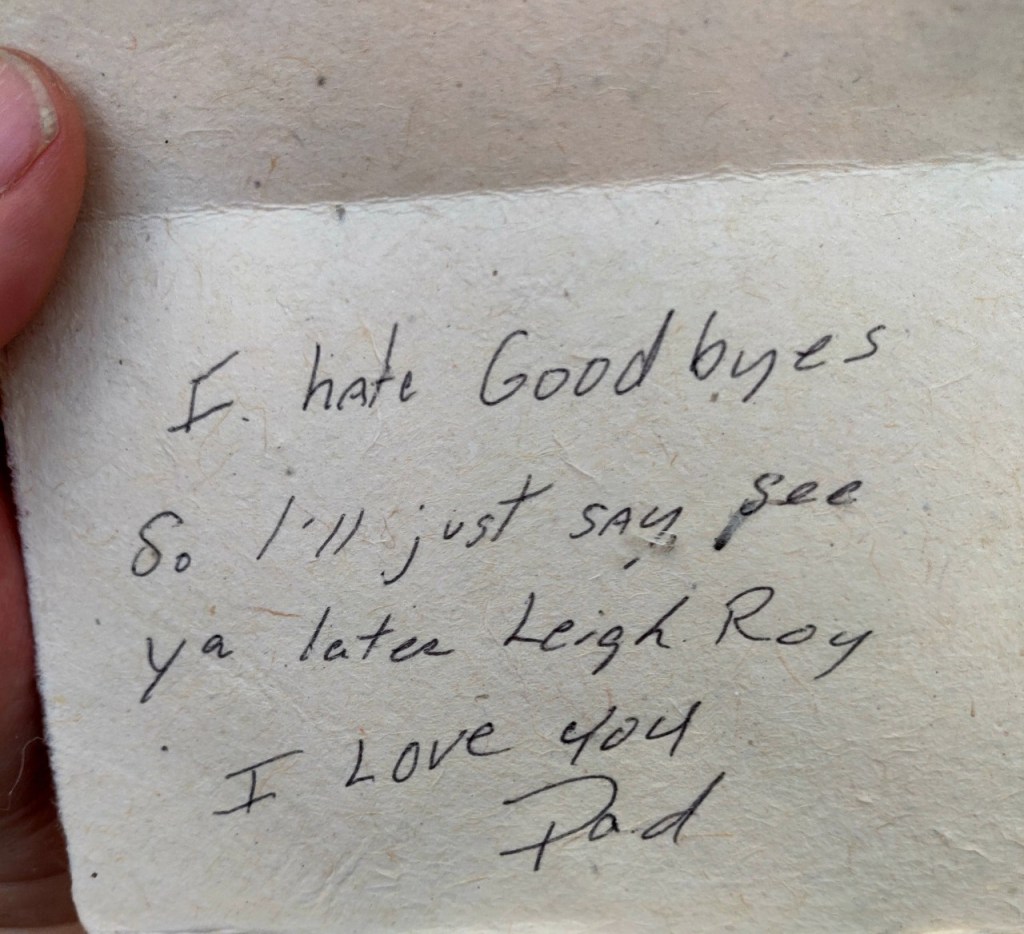 Bryan’s said, “I hate goodbyes, so I’ll just say, “See ya later, Leigh Roy. I love you. Dad.”