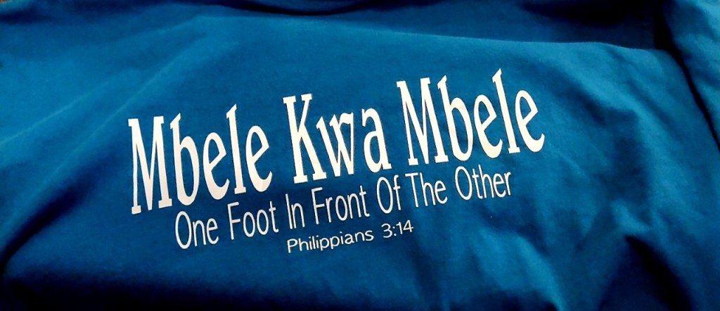 Sharing the story with my friend, Laci, she told me she learned the phrase ‘one foot in front of the other’ in Swahili while on a mission trip to Africa. We agreed it should be a slogan on a shirt. A few days later, I found a t-shirt on my desk printed with that phrase in Swahili (Mbele Kwa Mbele) and English along with the verse Philippians 3:14: